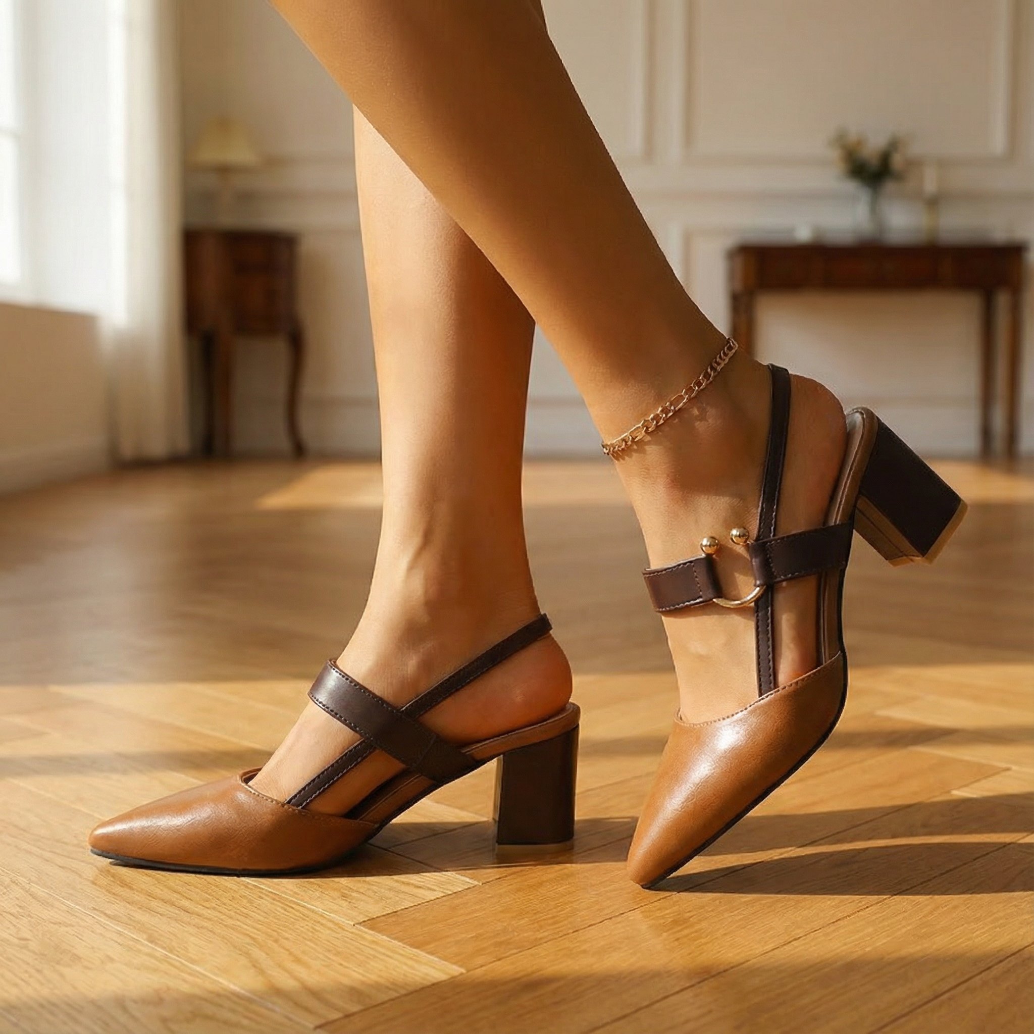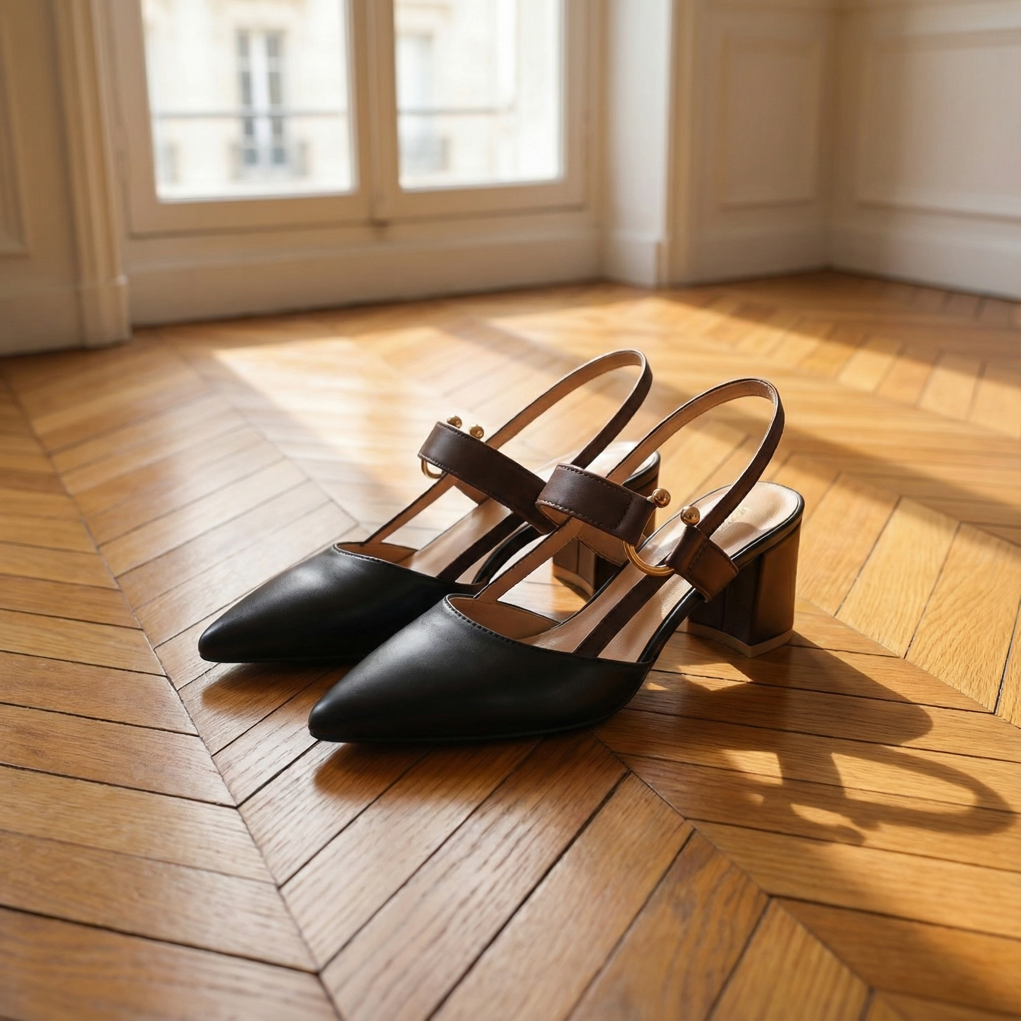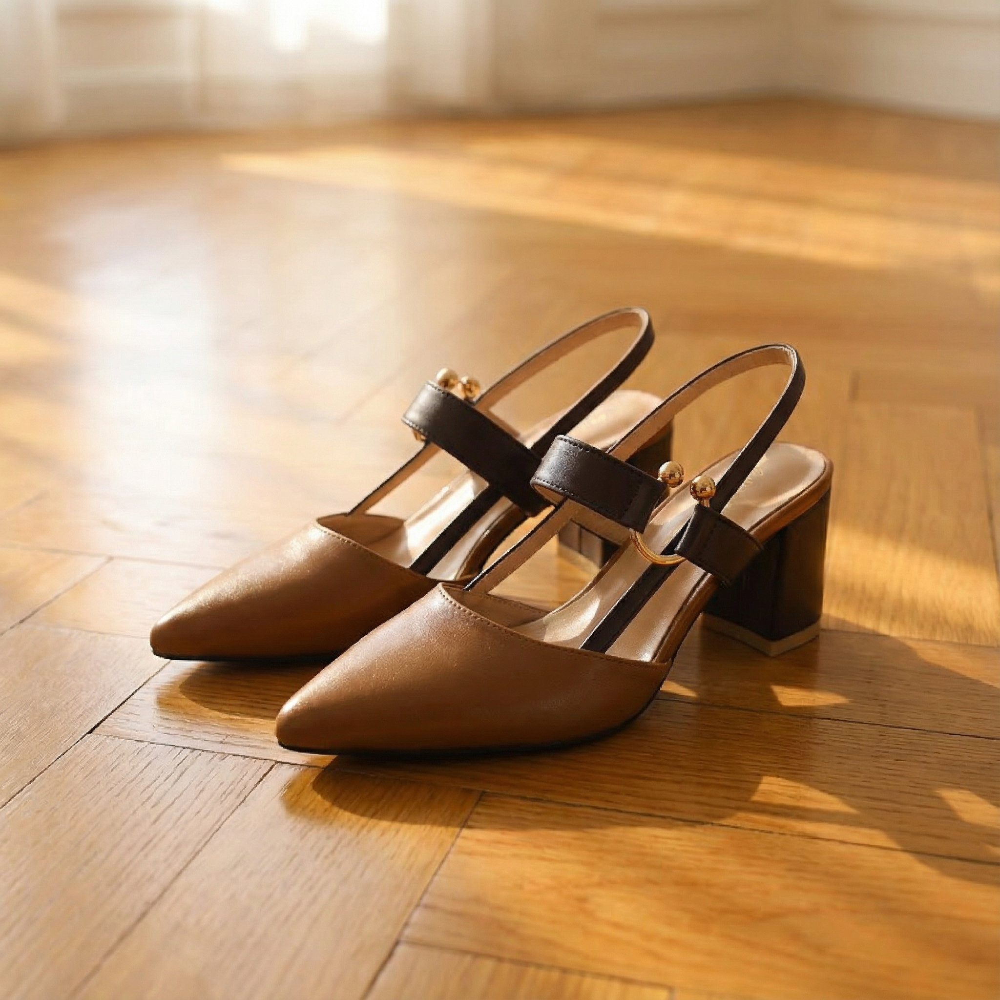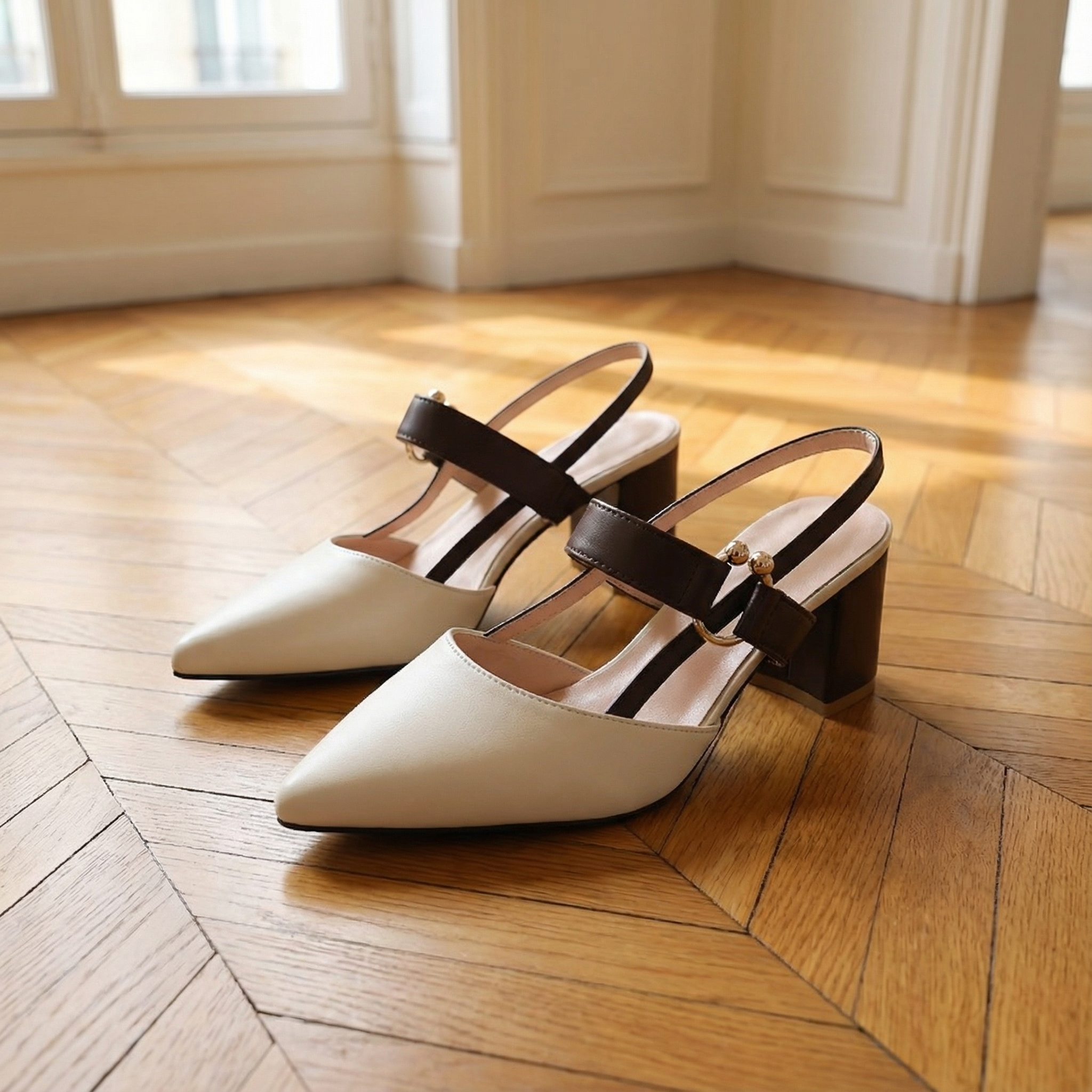 Women's pointed toe slingback heels with two-tone design and gold buckle hardware. Features structured block heel, adjustable double strap with D-ring closure, and contrast trim detailing. Soft upper with cushioned insole. Heel height 2 inches. A refined everyday style for office wear, smart-casual occasions, or polished daytime looks.