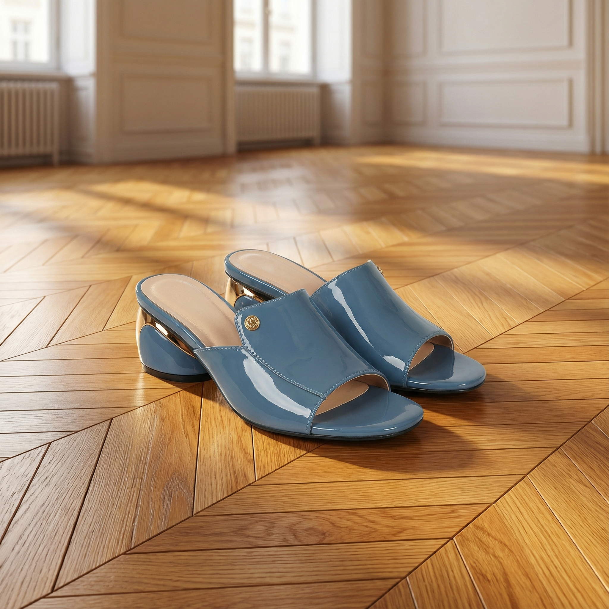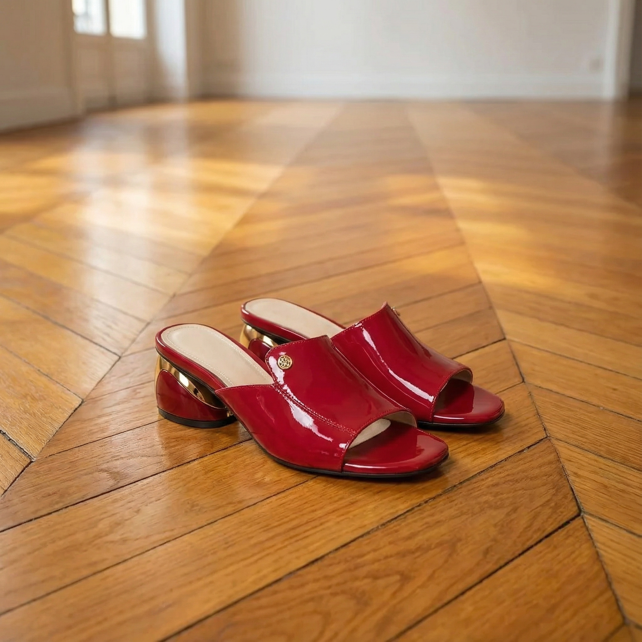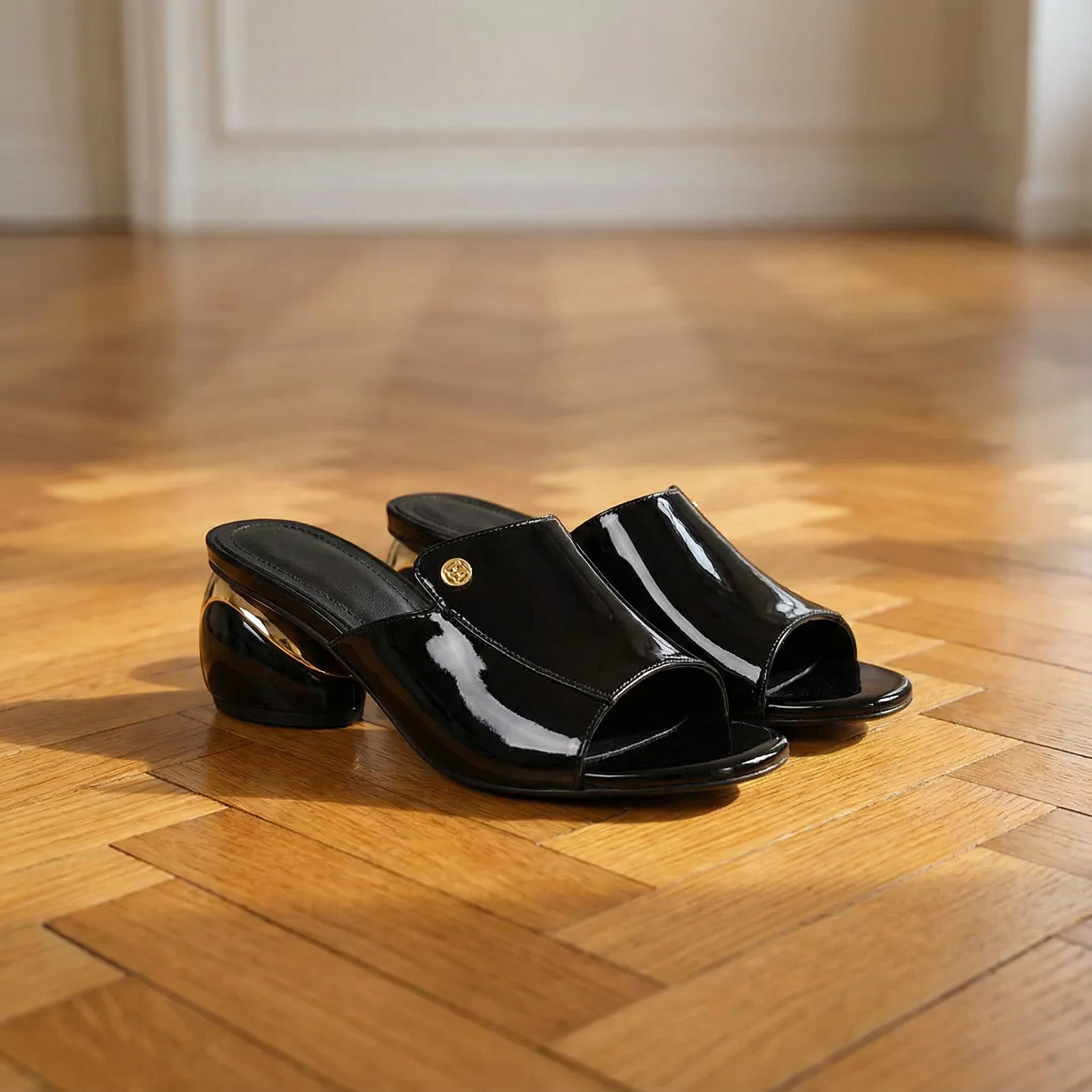 Women's open toe mule heels with high-gloss patent finish and statement sculptured ball heel. Features wide single strap with gold logo stud detail, slip-on design, and cushioned insole for comfort. Peep toe silhouette with metallic gold spherical heel. Heel height approximately 2.5 inches. A bold glamorous style for parties, evenings out, date nights, or special occasions.