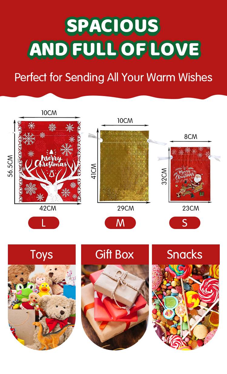 order to make you easy to open and fasten the gift bags, our Christmas gift bags have a on the opening mouth, just put the gift into the bags and fasten it, making it easy to close and open, protecting inner items and avoiding things missing