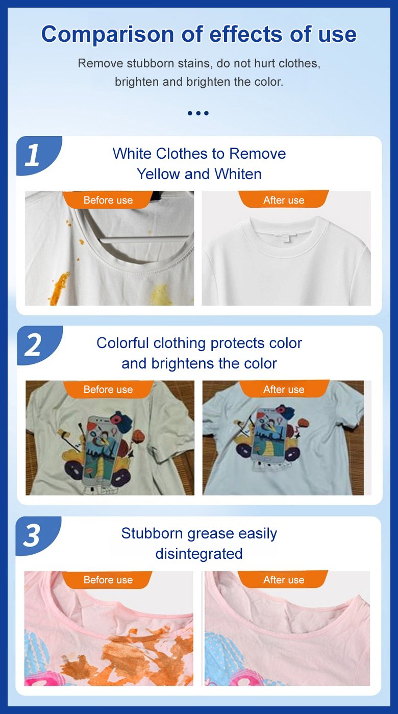 ADVANCED STAIN REMOVAL - Our color bleach laundry detergent is specially formulated with powerful ingredients that target and eliminate tough stains, leaving your clothes looking clean and fresh. Whether it's food stains, grass stains, or even grease marks, this detergent tackles them all with ease, restoring your garments to their original brilliance.