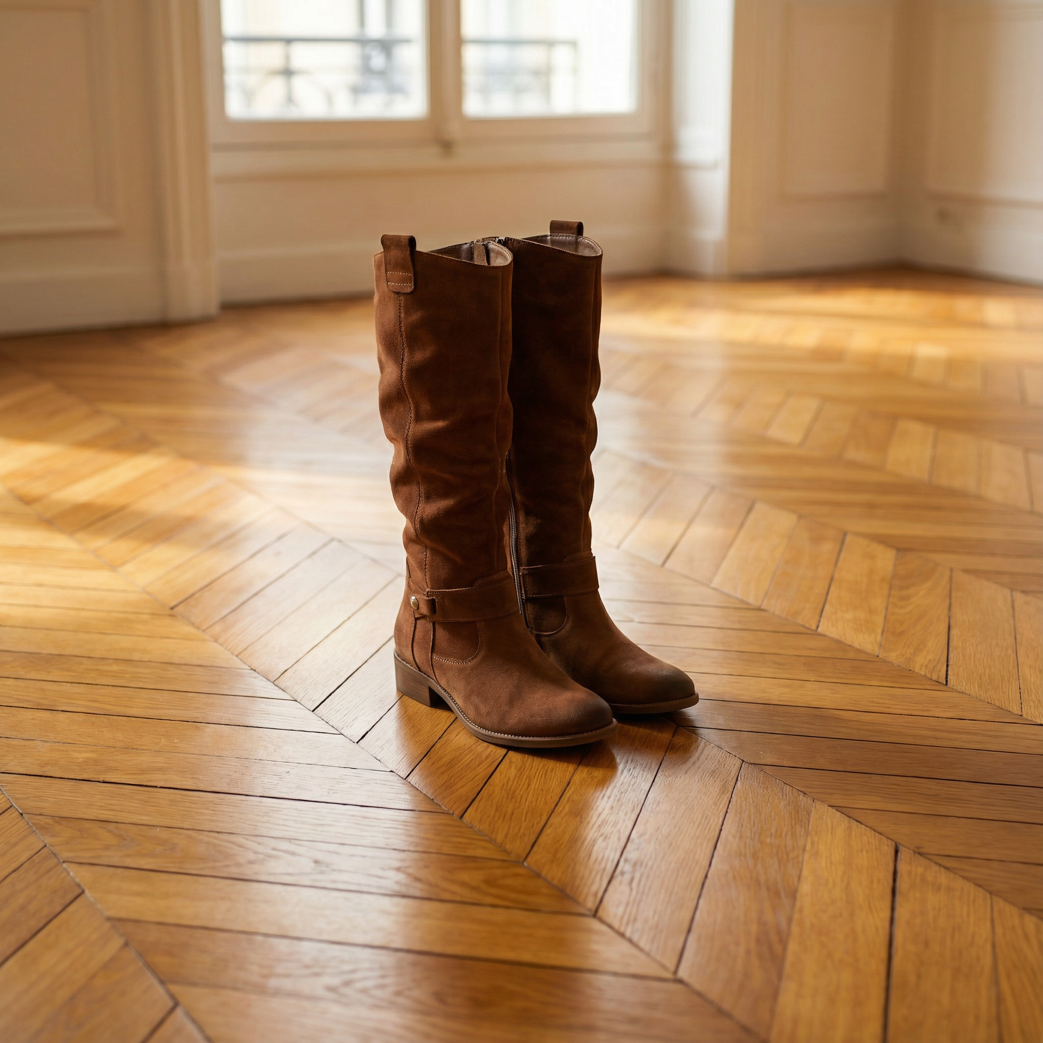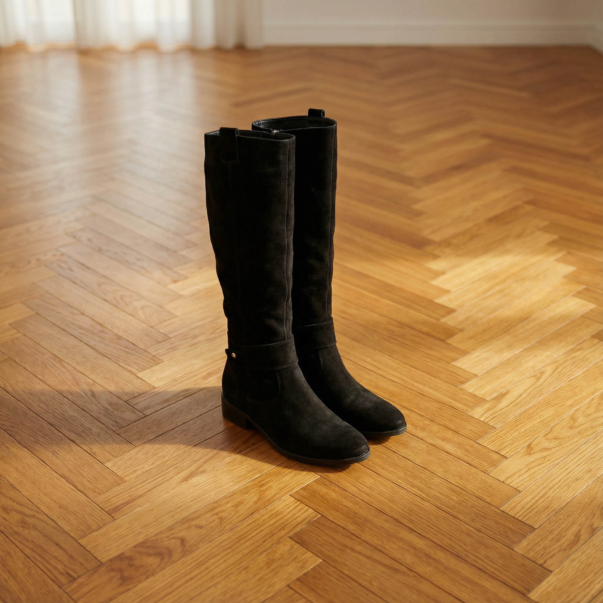 Women's knee-high boots with suede-style upper and slouched shaft. Features round toe, ankle strap with silver stud accent, pull tabs at top, contrast topstitching throughout, and low stacked block heel. Pull-on entry with rear zipper. Suitable for casual wear, everyday outfits, autumn and winter styling, or pairing with dresses, skirts, or jeans.
